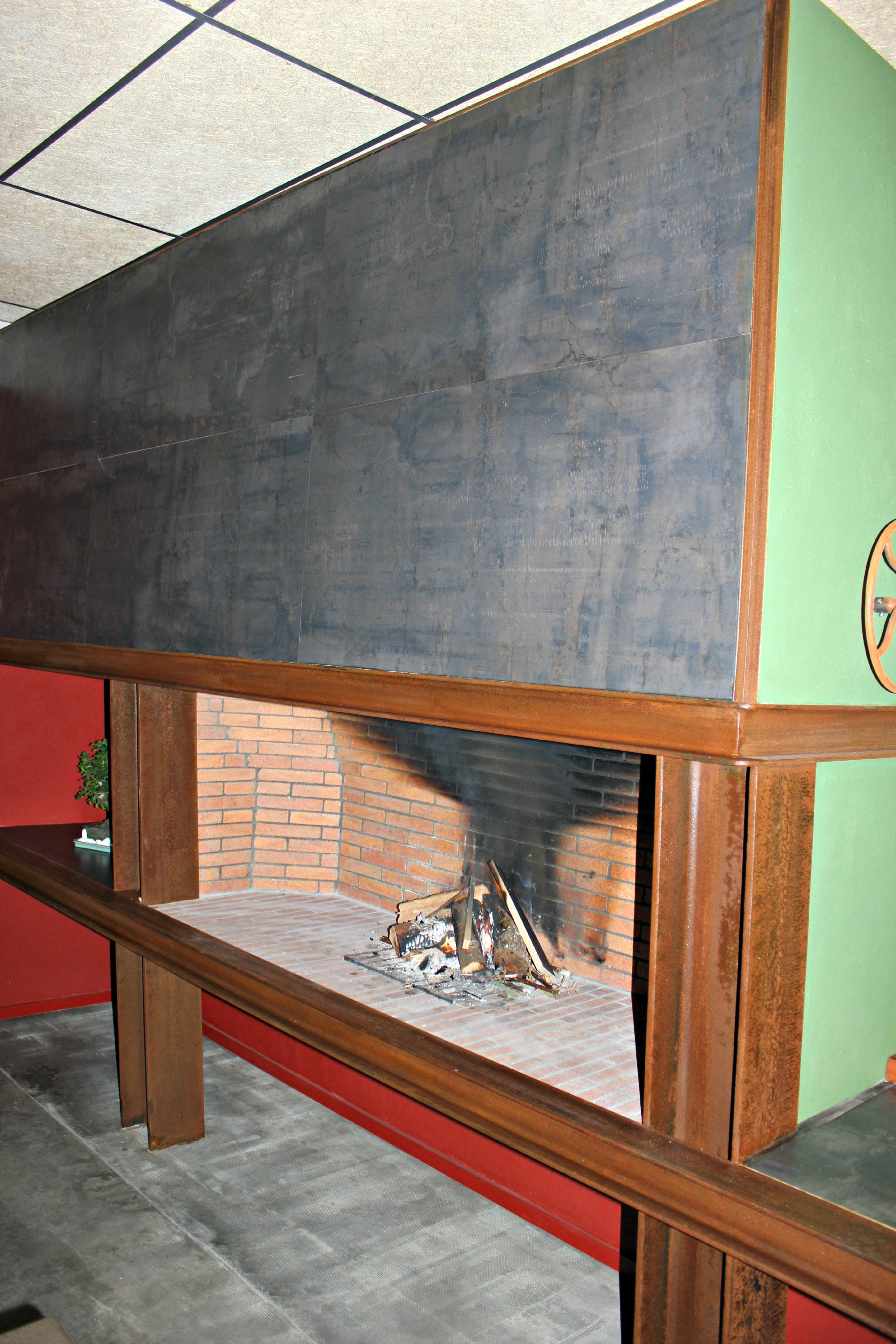Despite being a modern area, with a sound absorbing ceiling, the existing cement floor was preserved, restoring its most degraded parts with a reel that imitates the old antiskid engraving, a tool dating back from the thirties kept at Tané Construccion’s warehouse. However, the main features of the room are, on the one hand, the huge fire place, and on the other, the natural light. A big entrance was built into the wall facing south. For better light another big opening was made with a big door opening onto the patio, now a terrace for al fresco eating.
